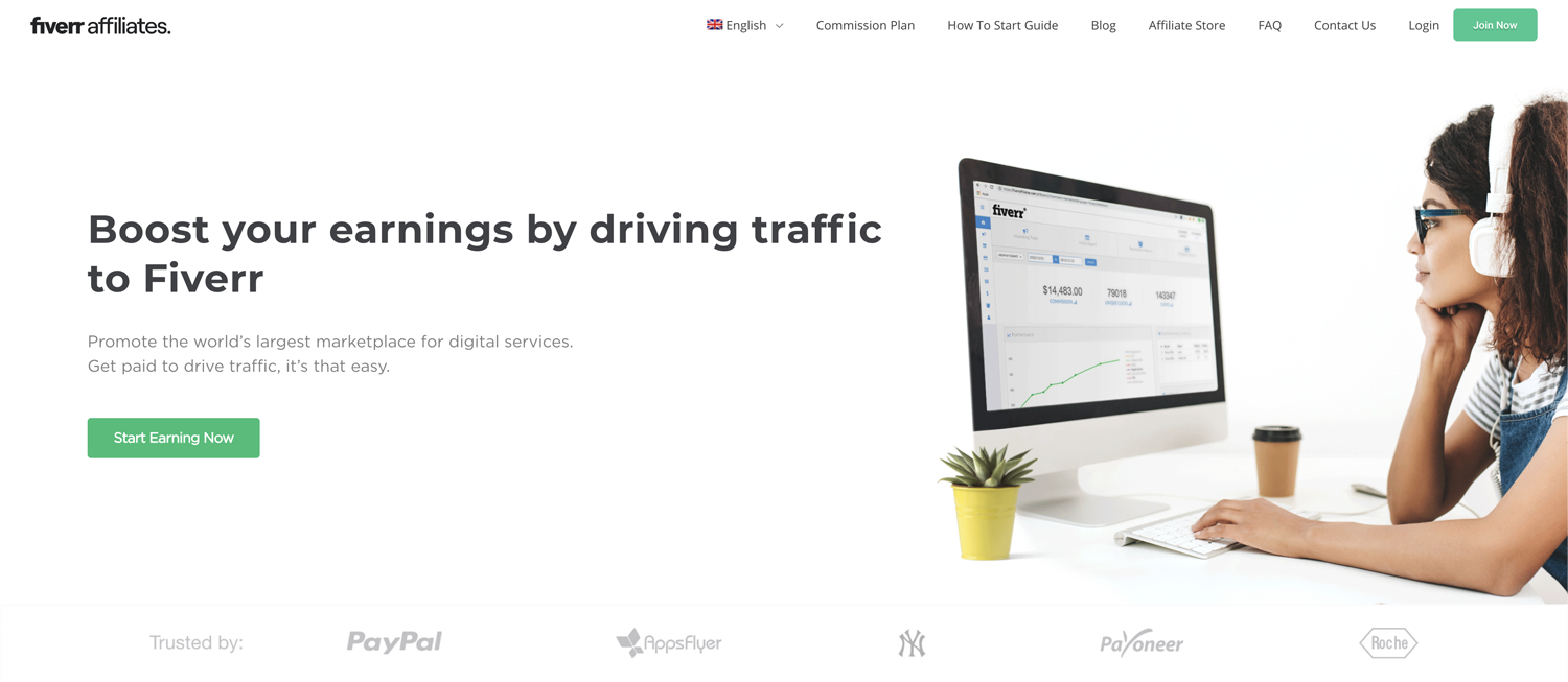 With two affiliate strategies, one hosted by Cellexpert, and the other by CJ Affiliate, Fiverr offers impressive share rates: 15 to 50 dollars CPA (click per action) for a first-time buyer and 10 dollars CPA + 10% revenue share for every purchase within 12 months.