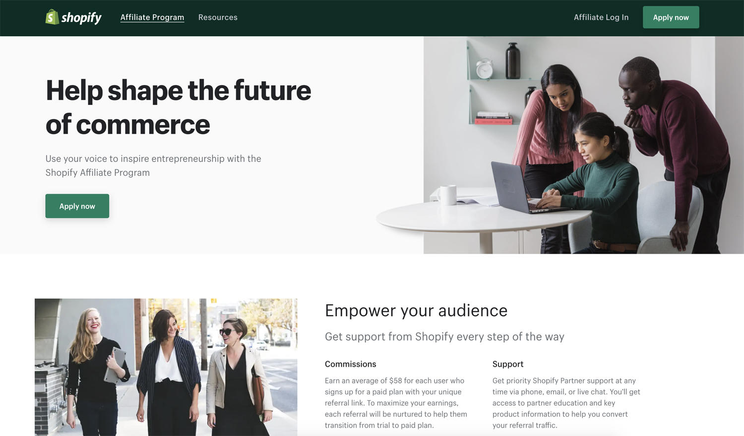 The gigantic e-commerce platform offers their referees generous amounts, but you have to be a Shopify partner (it’s super easy to sign up). If you join the Shopify affiliate program, you can earn, on average, $58 for any visitor that subscribes to a standard plan and no less than $2000 for plus plans.