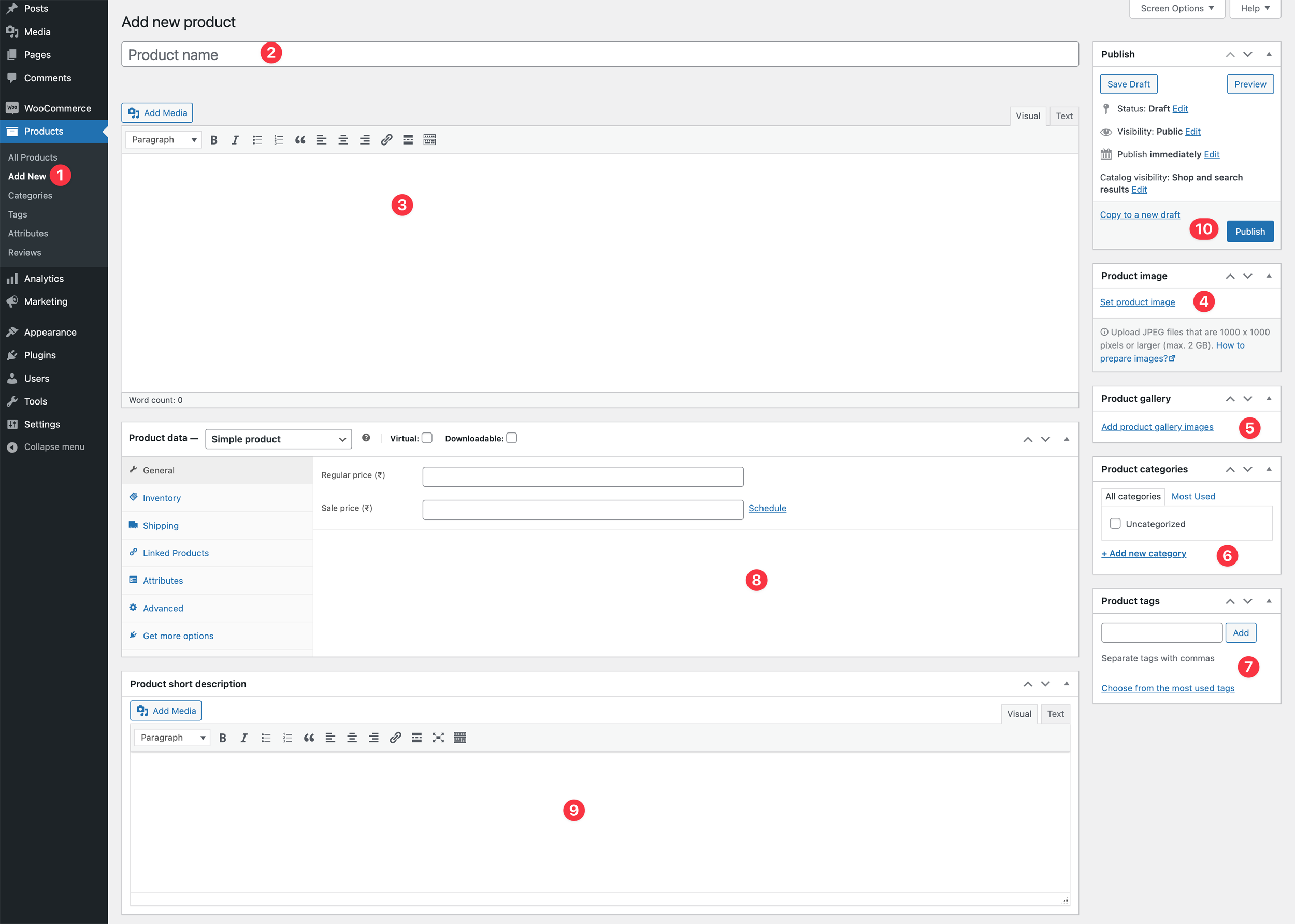 And finally, there is a section called Product short description, where you have to add a really short description of the product which will show up when there are multiple products on the page.