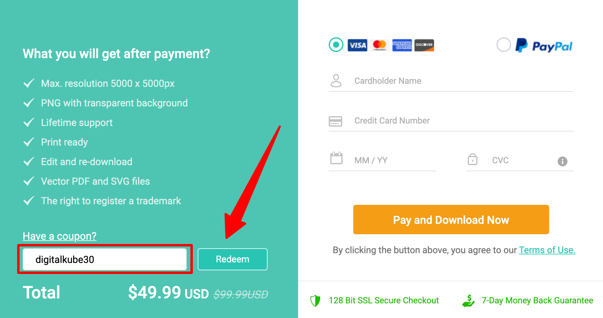 Finally, you’ll be landed on the checkout page. Simple click on Have a coupon? link and enter our DesignEvo coupon code: digitalkube30