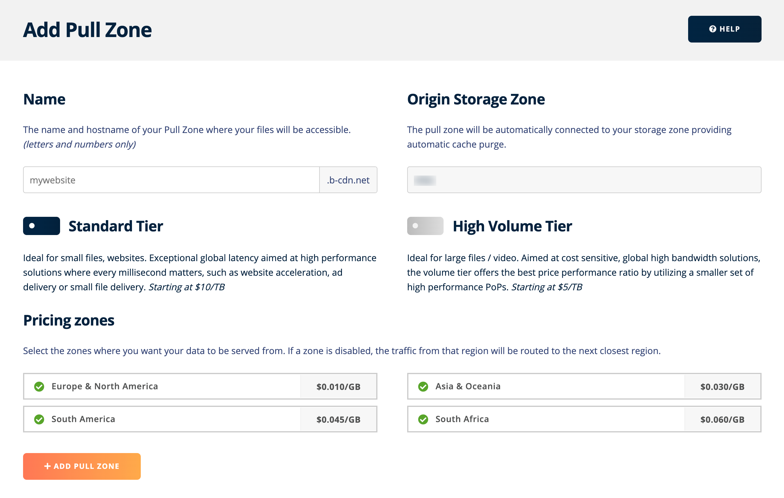 Enter a name for your pull zone. If you don’t use a custom domain, then this name will show up in your site’s address so name it carefully.