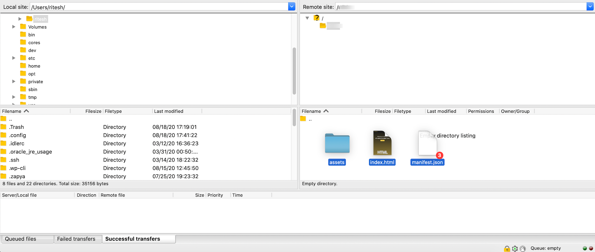 Simply drag and drop the site’s files to the lower right rectangular space in FileZilla.