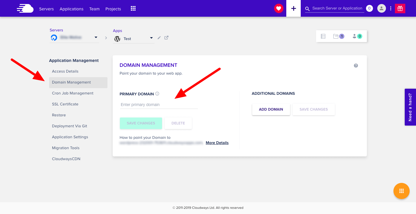 Now it’s time to associate the domain to your site in Cloudways. Go to Application » Domain Management and add the domain name to Primary Domain section.