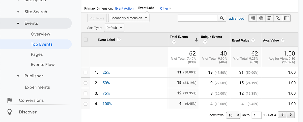 On this view, you can see all the number of events triggered for each percentage of scroll tracking.