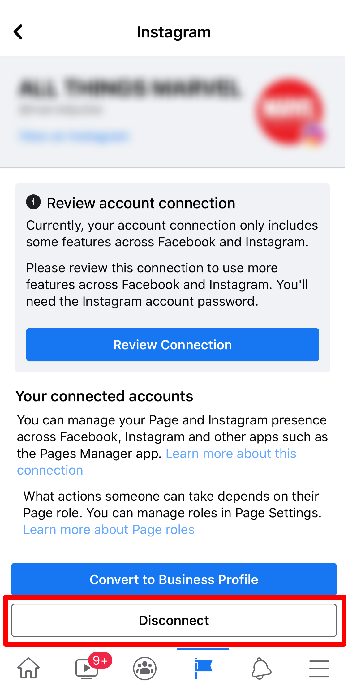 - Now you’ll see your connected Instagram page. If that is the right one, tap Disconnect at the bottom of the page