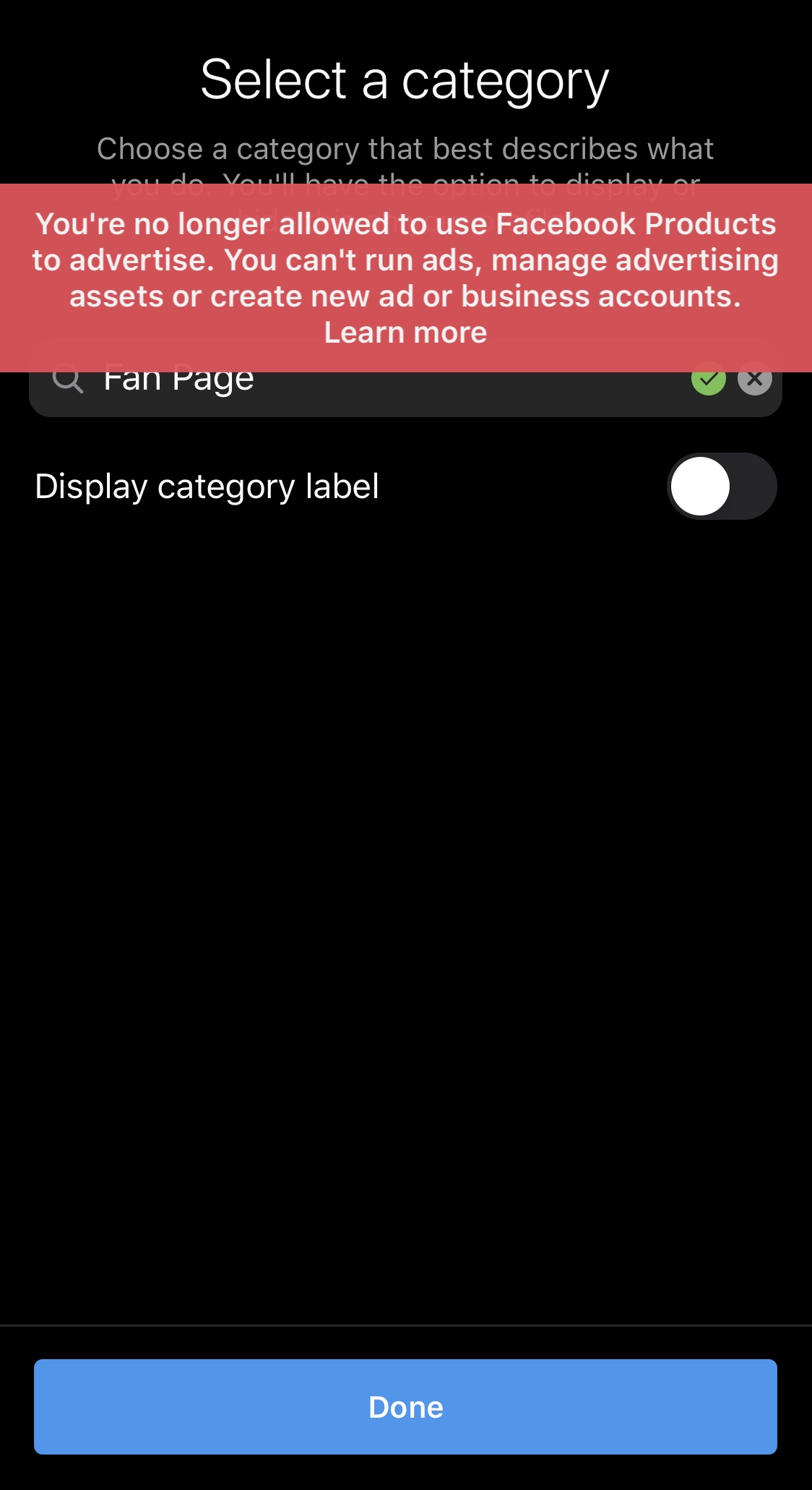“You’re no longer allowed to use Facebook Products to advertise. You can’t run ads, manage advertising assets or create new ad or business accounts. Learn more”