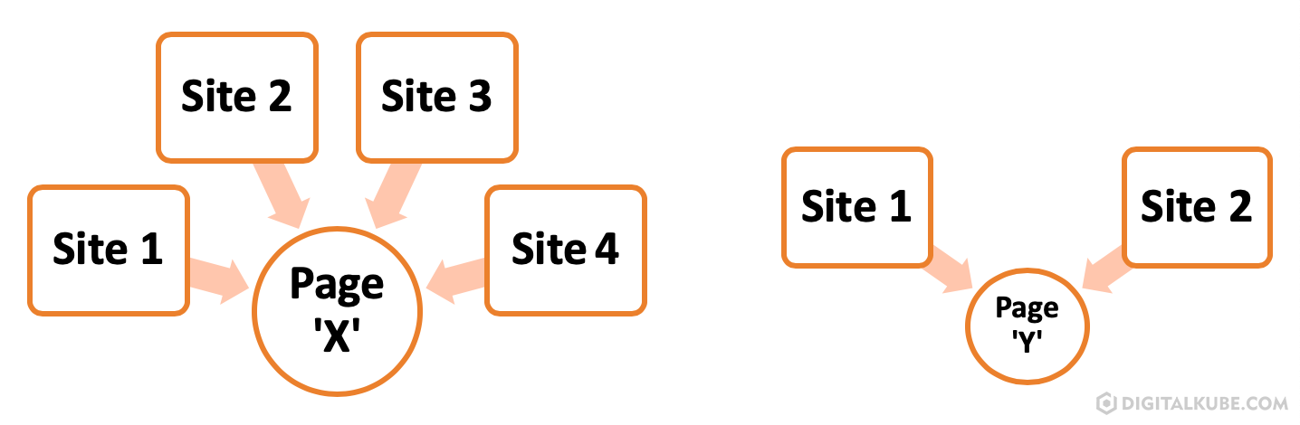 Consider a page or website that links to page ‘X’ also links to multiple other pages while the page that links to page ‘Y’ exclusively links to it (not to any other sites or pages).