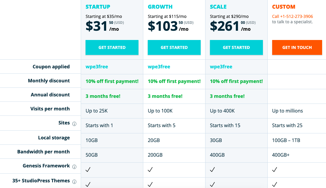 Our exclusive WP Engine coupon promo code helps you get 10% off the first payment on any WP Engine plan (Startup, Growth, Scale) or 3 months total free when you pre-pay for a year.
